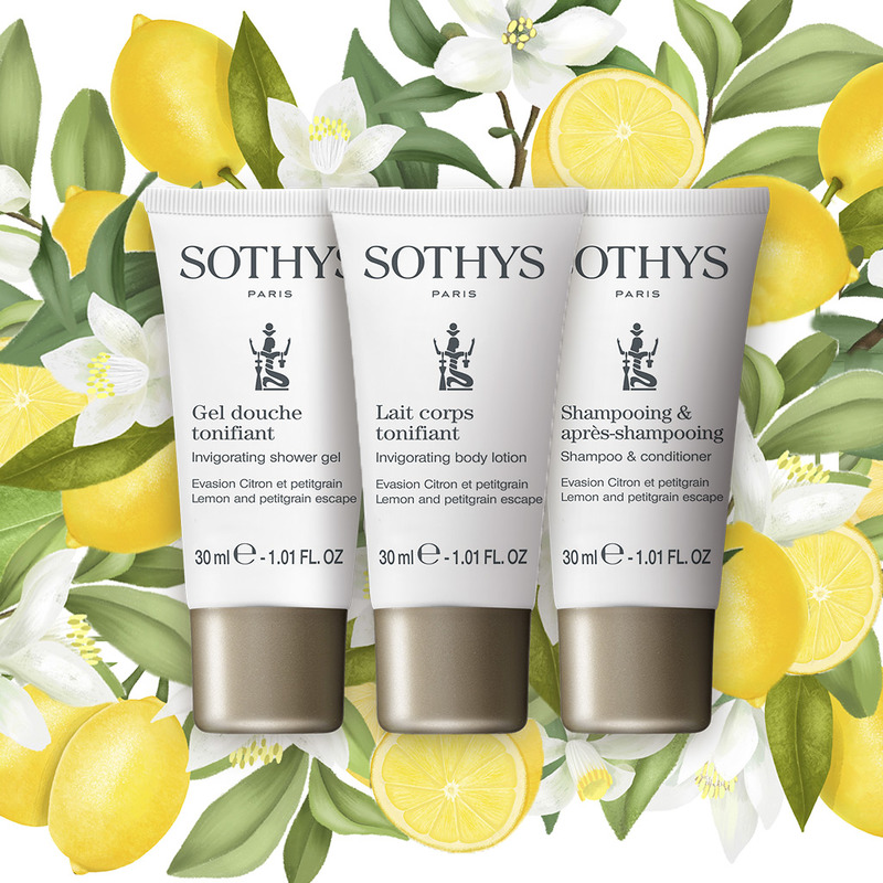 *Offer valid while stocks last and not available on sothys.fr. Purchase a Sothys® body treatment of your choice with a minimum duration of 60 minutes at the price displayed in your establishment, and get a free kit containing an invigorating shower gel (30 ml), an invigorating body lotion (30 ml) and a shampoo and conditioner (30 ml). The products contained in this kit can’t be obtained individually. see conditions with your beauty therapist.